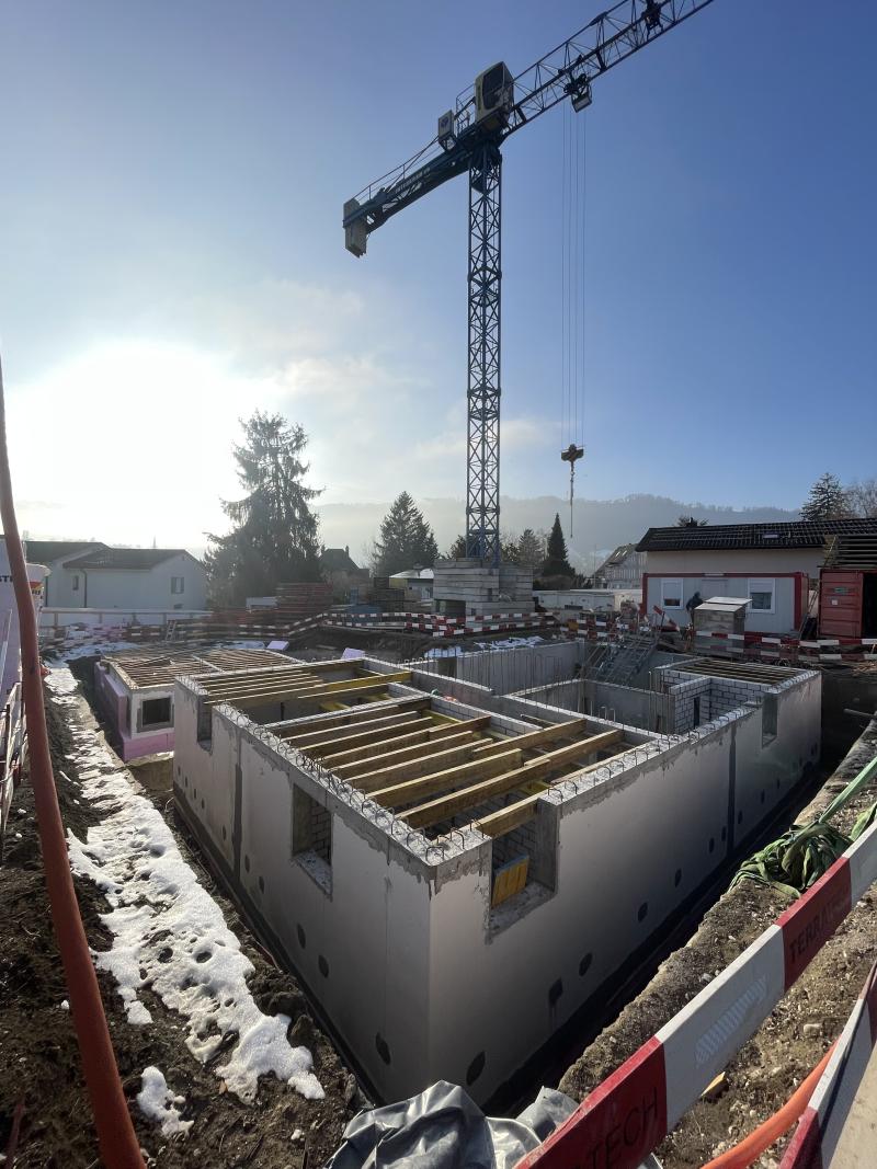 Nach dem Baustart unseres Projekts in Adliswil im Herbst geht es im neuen Jahr zügig weiter mit dem Betonieren der Erdgeschossdecke. Die beiden Gebäude, die als Massivbauten mit Holzdachstuhl realisiert werden, sind im Sommer bezugsbereit.