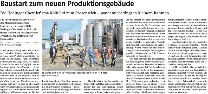 Der Spatenstich für das Produktionsgebäude der Dr. W. Kolb AG in Hedingen ZH ist erfolgt. Nach abgeschlossener Planung als Generalplaner gemeinsam mit unserem Fachplanerteam und den anlagenseitigen Spezialisten sowie erteilter Baubewilligung beginnen nun die Bauarbeiten und Anlageninstallationen. Wir freuen uns gemeinsam mit der Bauherrschaft über diesen wichtigen Meilenstein.