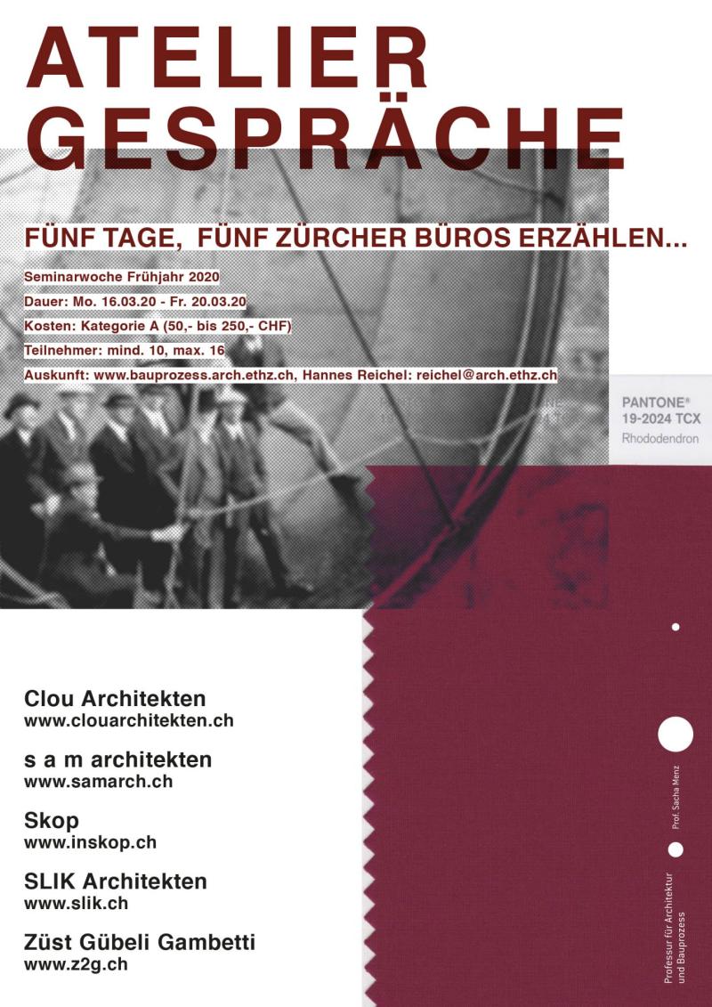 Fünf Tage – fünf Zürcher Büros erzählen: Während einer Woche besuchen wir täglich ein Zürcher Architekturbüro und erhalten Einblicke in ein breites Spektrum an Werdegängen, Arbeitsweisen und Projekten. Die Auswahl reicht von jungen Büros mit frühen Erfolgen über etablierte Akteure der Architekturszene bis hin zu spezialisierten Büros mit klarer Nischenstrategie. Im Zentrum stehen neben den gebauten Projekten auch Themen wie Bürogründung, Organisation, Finanzierung, Akquise sowie Kosten-, Lohn- und Gewinnstrukturen. So werden die Wechselwirkungen zwischen Bürostrategie und architektonischer Praxis direkt vor Ort nachvollziehbar.