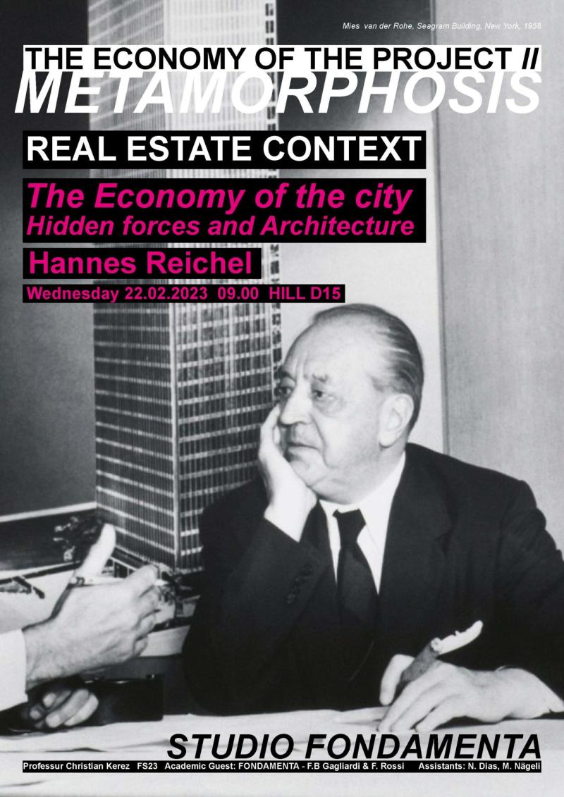 Hannes Reichel wurde eingeladen, im Rahmen der Entwurfsklasse «The Economy of the Project, Forms of Living» am Lehrstuhl Christian Kerez / Academic Guest Studio Fondamenta an der ETH Zürich eine Gastvorlesung zum Thema «Die Ökonomie der Stadt – versteckte Kräfte und Architektur» zu halten.