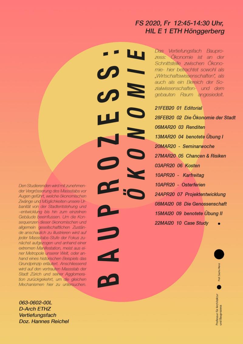 Im Frühjahrssemester 2020 startet erneut das Vertiefungsfach «Bauprozess: Ökonomie» bei Dozent Hannes Reichel. Das Fach untersucht die Schnittstelle zwischen Ökonomie und gebautem Raum und zeigt, wie wirtschaftliche und gesellschaftliche Rahmenbedingungen Stadt und Architektur vom städtebaulichen Massstab bis zum einzelnen Gebäude prägen. Anhand internationaler Beispiele und Rückführungen auf Zürich werden diese Mechanismen vergleichend analysiert. Im Zentrum stehen praxisnahe Themen wie Kosten, Rendite, Risiken und Potenziale, die in Fallstudien und Übungen aus der Perspektive verschiedener Projektbeteiligter behandelt werden. Die Studierenden arbeiten dabei aktiv an Fallbeispielen und individuellen Themen im Rahmen von Wahlfacharbeiten mit.