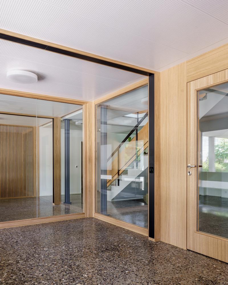 Nach kurzer Bauzeit konnten wir als Generalplaner, Architekten und Baumanager den Umbau an die Nutzer übergeben. Für die Stiftung Zürcher Kinder- und Jugendheime ZKJ wurde im ehemaligen Jugendheim Erika in Zürich-Wipkingen ein neuer Empfangs- und Sitzungsbereich realisiert. Der denkmalgeschützte, 1959 von Werner Frey entworfene Pavillonkomplex wurde behutsam weiterentwickelt und um eine reversible Holzkonstruktion im Eingangsbereich ergänzt. Die Umsetzung erfolgte in enger Abstimmung mit Denkmalpflege und Behörden und stellte insbesondere aufgrund der Integration im Fluchtweg sowie des Bauens unter laufendem Betrieb besondere Anforderungen.