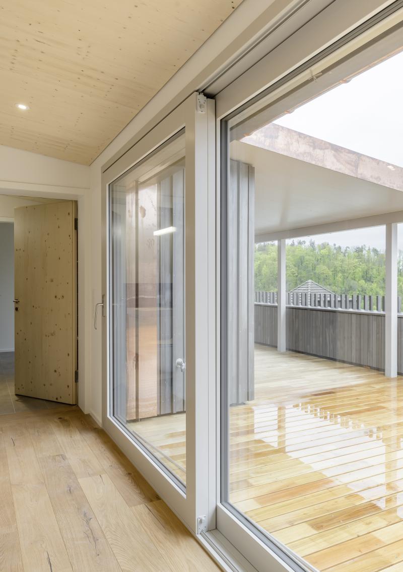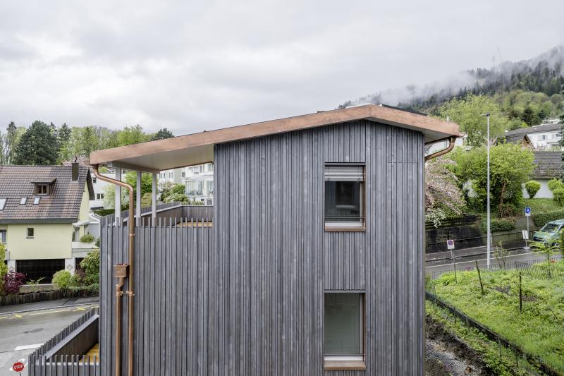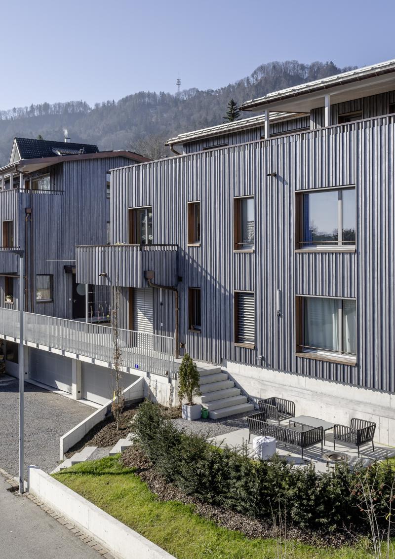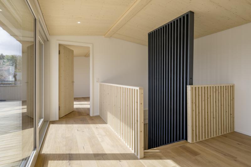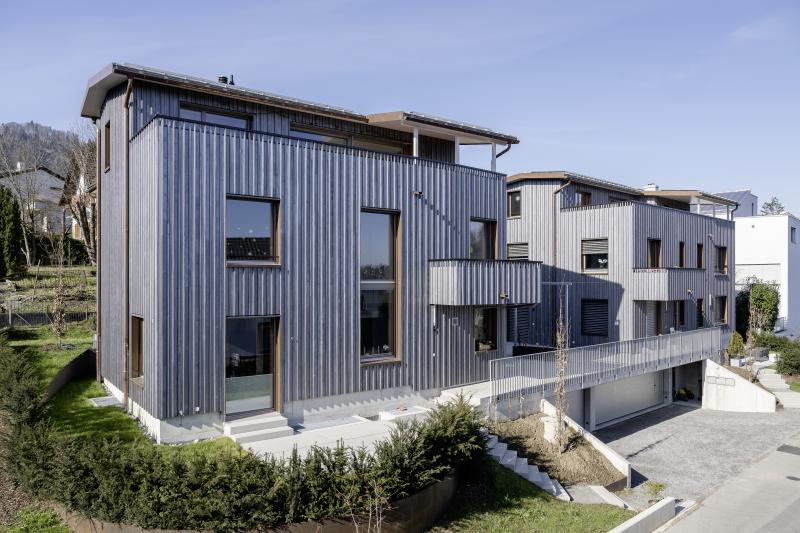 Auf einem steilen Hanggrundstück in Adliswil entstehen zwei Mehrfamilienhäuser mit insgesamt drei Wohnungen und gemeinsamer Tiefgarage. Die dunkel vorvergrauten Holzbauten mit vertikaler Verschalung stehen auf einem gemeinsamen Sichtbetonsockel. Kupferdetails an Fensterlaibungen, Dachrinnen und Fallrohren setzen warme, helle Akzente zur Fassade. Die Holzkonstruktion besteht aus vorgefertigten Holzwänden und Lignatur-Schichtholzdecken mit Perlitschüttung als Schalldämmung. Innen prägen transparent lasierte oder kräftig blaue Fichtenholzoberflächen das «Wohnen im Holz». Auf den Dächern sorgt eine Photovoltaikanlage für Strom. Das südliche Haus beziehen die Auftraggeber selbst, die EG-Wohnung im nördlichen Haus wird vermietet und die Maisonettewohnung ist für die Grosseltern vorgesehen. Das Projekt wird von der Machbarkeitsstudie über den Landerwerb bis zur Bauleitung von uns durchgeführt.