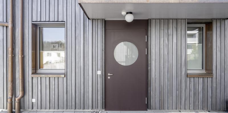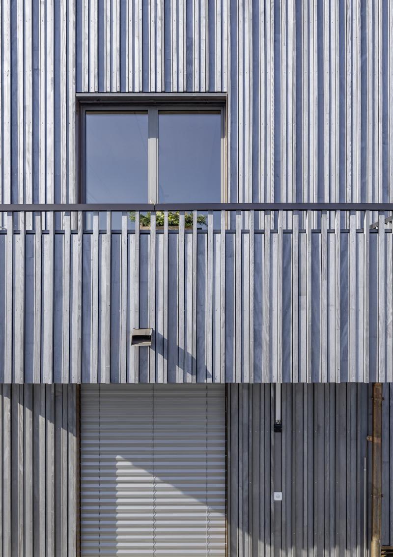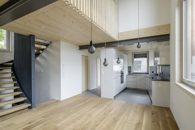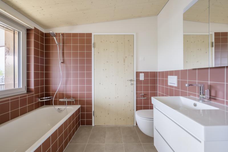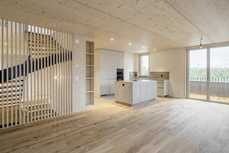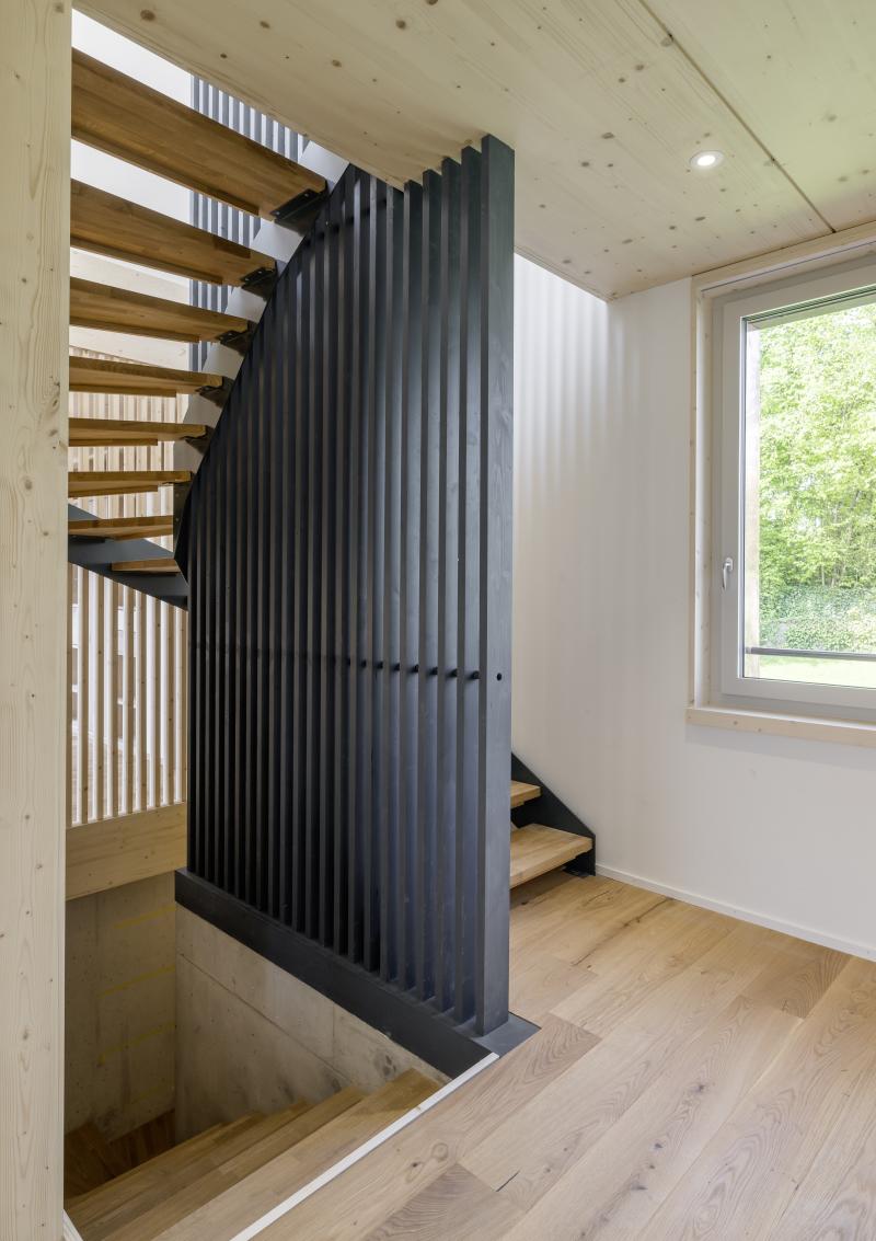 Auf einem steilen Hanggrundstück in Adliswil entstehen zwei Mehrfamilienhäuser mit insgesamt drei Wohnungen und gemeinsamer Tiefgarage. Die dunkel vorvergrauten Holzbauten mit vertikaler Verschalung stehen auf einem gemeinsamen Sichtbetonsockel. Kupferdetails an Fensterlaibungen, Dachrinnen und Fallrohren setzen warme, helle Akzente zur Fassade. Die Holzkonstruktion besteht aus vorgefertigten Holzwänden und Lignatur-Schichtholzdecken mit Perlitschüttung als Schalldämmung. Innen prägen transparent lasierte oder kräftig blaue Fichtenholzoberflächen das «Wohnen im Holz». Auf den Dächern sorgt eine Photovoltaikanlage für Strom. Das südliche Haus beziehen die Auftraggeber selbst, die EG-Wohnung im nördlichen Haus wird vermietet und die Maisonettewohnung ist für die Grosseltern vorgesehen. Das Projekt wird von der Machbarkeitsstudie über den Landerwerb bis zur Bauleitung von uns durchgeführt.