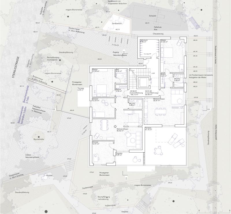 Freiräume und Aussenanlagen sind terrassiert, differenziert und ökologisch wertvoll gestaltet.