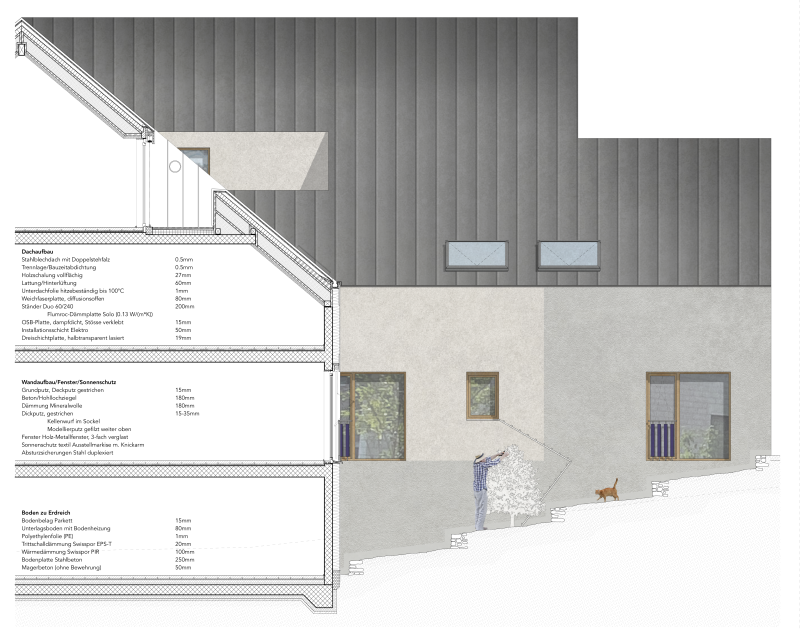 Die fein gegliederte, versetzte Volumetrie des Neubaus nimmt die Massstäblichkeit der kleinteiligen, benachbarten Arbeiterhäuser.