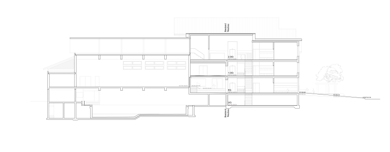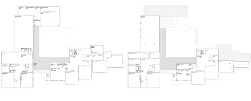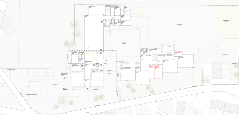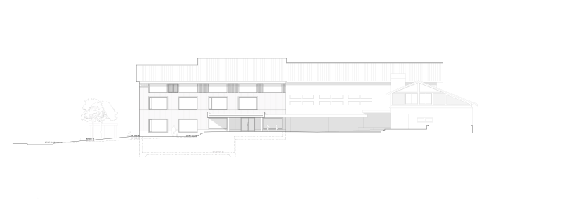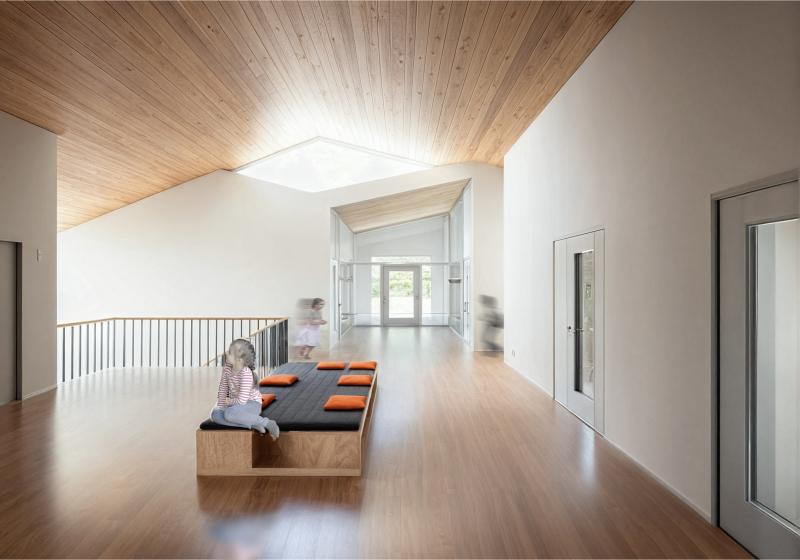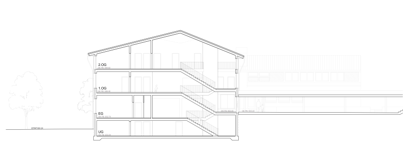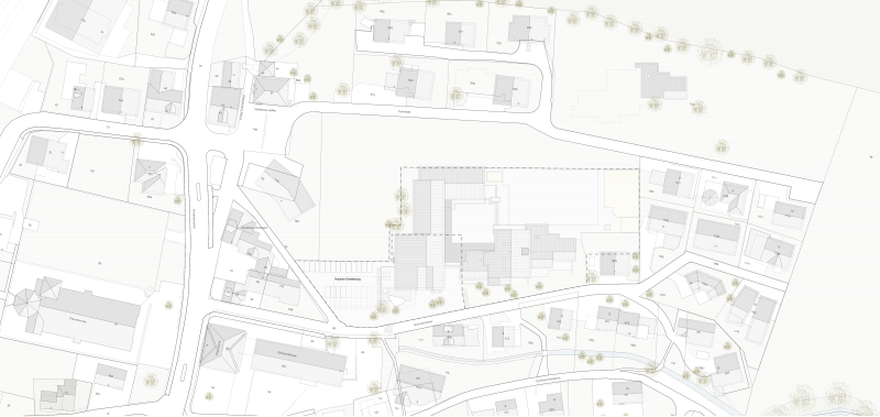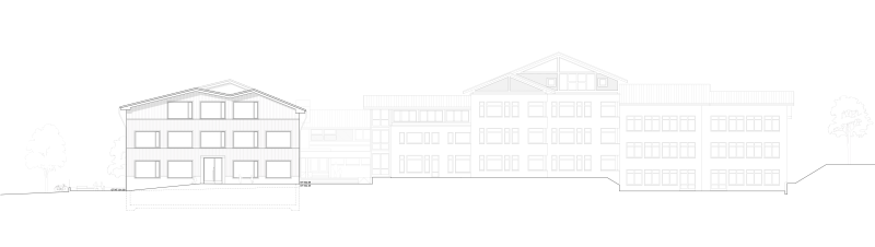 Die Anlage ist durch einen höher gelegenen Hof und ringförmig angeordnete Schul- und Sportbauten geprägt, erschlossen über eine grosszügige Freitreppe mit Vordachzone. Die Erweiterung wahrt den Abstand zur Schulstrasse, verdeckt das bestehende Schulhaus nicht und respektiert die Eigenständigkeit des Gemeindehauses. Sie fügt sich ressourcenschonend über den bestehenden Kindergartenanbau an die Sporthalle an und schafft eine attraktive neue Südfassade.