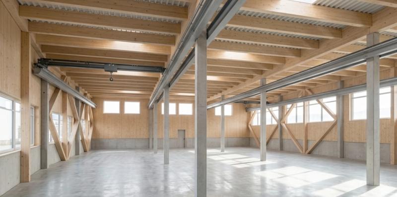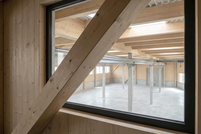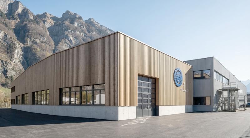 Die Produktionsstätten der Sauter Bachmann AG, einem weltweit führenden Hersteller von hochpräzisen Zahnrädern und Getriebekomponenten liegen spektakulär im Glarner Tal am Fluss Linth. Rechts und links ragen die Glarner Alpen grau empor (gleich nebenan wurde der Stein für Eternit abgebaut und und weiterverarbeitet). In diesem Kontext wurden wir beauftragt einen Erweiterungsbau für die «Härterei» des Unternehmens zu erstellen. Über einer Betonplatte und -sockel erhebt sich eine Hybridkonstruktion aus lokalem Nadelholz und Betonstützen, die durch hölzerne Diagonal-Windverbände stabilisiert wird. Die Konstruktion nimmt zum einen die hohen Schnee- und Windlasten dieser Region auf und bietet zum anderen den Aufhängepunkte für die Laufkatzen der Produktion. Bandfenster umfangen das Gebäude und rahmen den Blick in die Landschaft.
