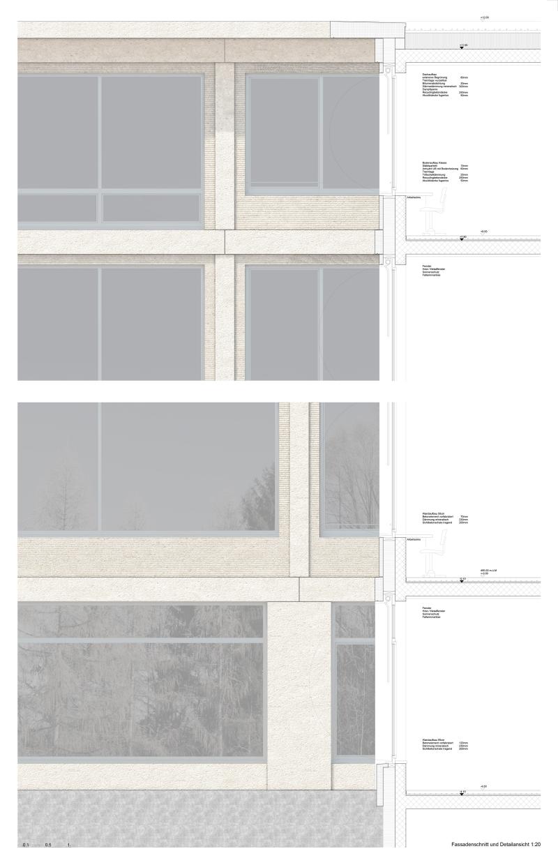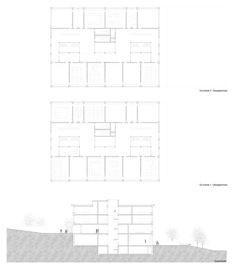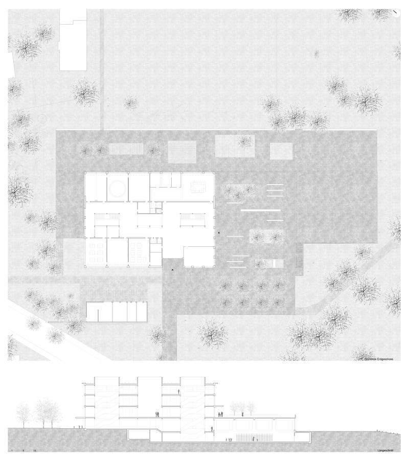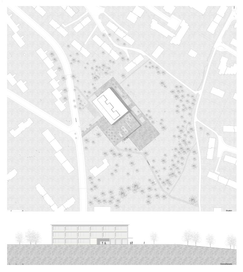 Das Gebäude reagiert sensibel auf die Topografie, integriert die Mensa, Bibliothek und Mehrzweckräume und hält das Volumen im quartierverträglichen Mass.