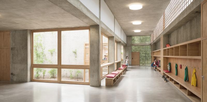 Belichtete Erschliessungszonen mit Lichthöfen verbinden die beiden Gebäudeflügel, während flexibel kombinierbare Klassen- und Betreuungsräume interaktives Lernen ermöglichen.